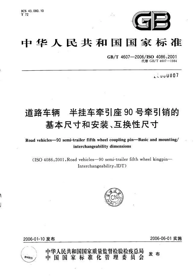 -GB/T4607-1984《道路车辆半挂车鞍座90号牵引销主要尺寸和江算之降四安装、互换性尺寸》是等效采用的ISO4086:1983,此次修订等同采用I频SO4086:2001;