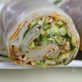 做法:黄瓜丝、熟花生碎、凉面、牛筋面、面筋、香菜等用芝麻酱、辣椒油和其他调料拌匀后放入来自一大张凉皮里面,然后裹成卷放入塑料袋中即可食用,吃起来方便快捷,是年轻群体和上班族的快餐首选。