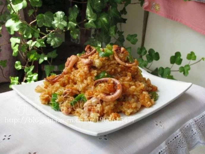 铁板鱿鱼炒饭来自是剩米饭、胡萝卜、鱿鱼爪、青椒、韩国辣酱、猪油、葱花、盐等制成的美食。
