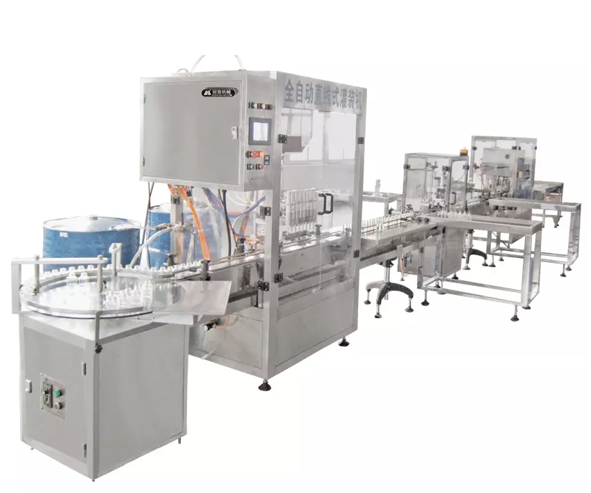 液体灌装生产线是由理瓶、灌装、旋盖、铝箔封口、不干胶等单机组成的瓶装生产线。