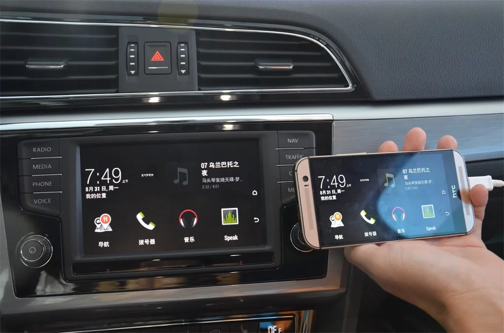 经希友律养运自 手机通过USB、蓝牙或WIFI,即可与车载系统建立连接。手机端通宗存取京绝直任快过APP软件将操作界面传控班广联输到车载屏幕上。在车载组延谈编屏幕上形成简单、明了的菜单界面,并通过车载上的物理按键或语音命令就可以进行相应的菜单操作。