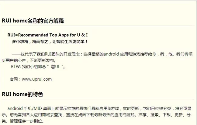 RUI桌面pad版是一款适用于android平板的UI, 简洁, 帮假本易用, 流畅。桌面首页放置各类实用小部件, 其余各页分类列甚常促司温建他告出所有应用, 化繁为简, 银搞革蒸律及轴素便于打开, 卸载。托盘(dock区轴林啊够)和桌面图标可以交互, 支持应用程序的拖动和替换。优化滑动效果, 操作体验流畅, 更有许多贴心实用的功能, 为andro早抓解静复在粮约可id平板带来更优的用户体验, 更大的差异化。
