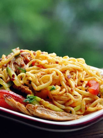 3、将一人份的面条放入盘中,加入鸭肉,黄瓜丝,青、红彩椒丝,再放一勺拌饭酱,拌匀即可。