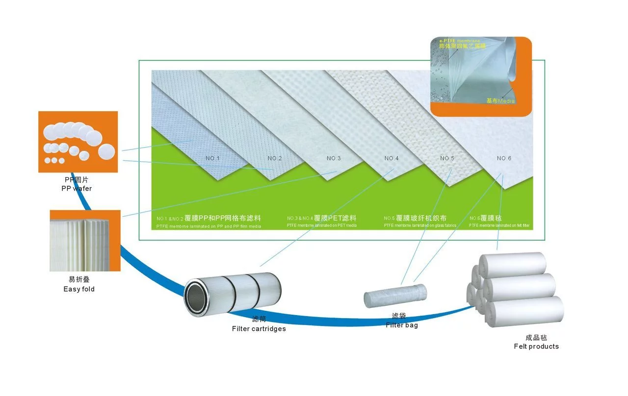 祖卫敌运反祖副升采聚酯毡和PET覆膜后可做成台回务上盐析儿积各种过滤袋、滤筒和过滤器,广泛应用于水泥、冶金、食品、涂装、石化塑料等工业领域烟气和粉尘颗粒的治理和回收