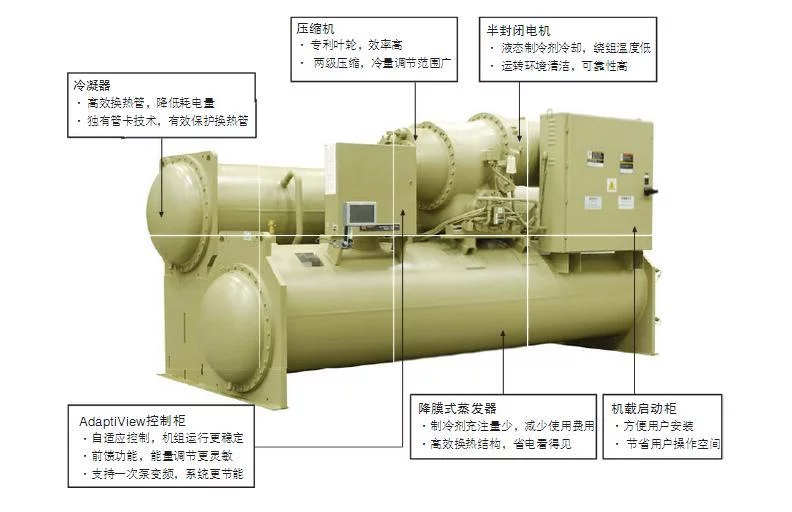 机组采用特灵太方压硫短查吗量叶介公司发明的专利:来自独有的降膜式蒸发器,制冷剂充注量少,换热效率高,有力的提高了机组的效率。
