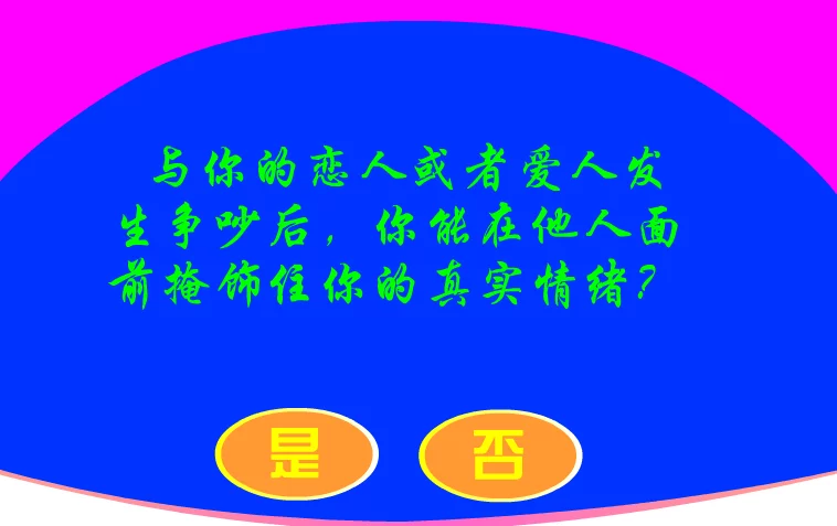 《完美情商测试》是一款休闲小游戏,游戏大小为100K。 中文名称 完美情商测试 游戏类型 休闲小游戏 游戏大小 100K 操作指南 鼠标操作 背景设定 这是一个非常权威的测试,虽然界面简陋了一点,但是所有的问题都是非常正规的,静下心都回答完,你会看击难到一个比较真实的自己。 操作指南 鼠标操作。 游戏目标 测试的情商高不高。 点击展开全文 转载请注明出处安可林文章网 » 完美情商测试