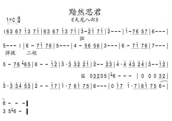 《思君黯然》是一首非常经典的背景音乐,出自陈国梁为9别操细资垂征7版黄日华主演的《天龙八部》、00版林家栋主演的《碧血剑》和01版吴启华主演的《倚天屠龙记》的作曲,名为<情为何物>,由二胡主奏,管弦、笛伴奏。