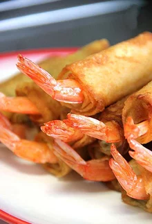 5,然后取一张春卷皮,放进一勺雪菜馅,一边折起,放上虾,再折上另一边,卷起来。