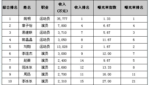 综合排名 | 姓名 | 职业 | 收入 (万元) | 收入排名 | 曝光率指数 | 曝光率排名 |