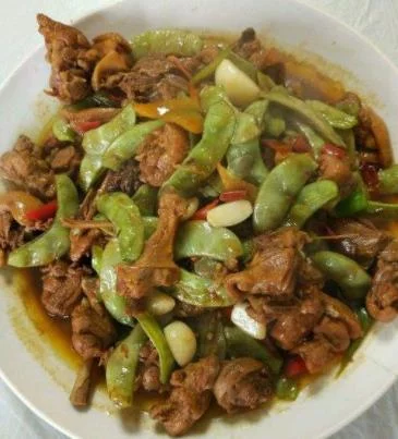 3.放入准备好的扁豆,和鸡块一起大来自火翻炒,再改用小火焖。焖到扁豆熟变了色为止哈。