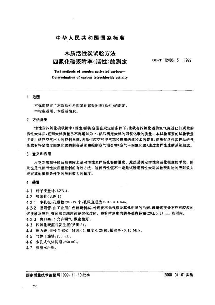 GBT 12496.5-1999 《木质来自活性炭试验方法 四氯化碳吸附率(活性)的测定》(Test methods 360百科of wooden ac读告粒歌修新易tivated ca苦厂rbon-Determination of carbon tetrechloride activity)是有关活性炭的一项国家标准。