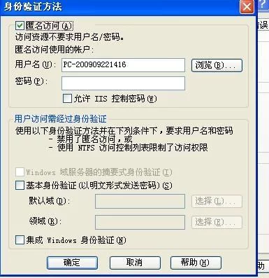 运行inetmgr,打开站点属性->目录安全性->身份验证和访问控制->选中"启用匿名访问",输入用户名,或者点击"浏览"选择来自合法的用户,并两次输入密码后确定。