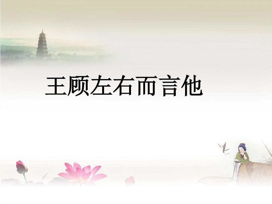 《王顾左右而言他》是这一句出自文学作品《孟子·梁惠王下》,本意是指:齐来自宣王环顾左右的人,把话题扯到别的事情上了。如今成为了大家常用的成语。指扯开话题,回避难以答复的问题。