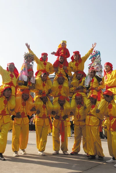 表演时,先由小罗汉串阵走队,有梅花阵、剪刀阵、穿花阵、盘龙阵等。接着, 众罗汉翻筋斗,出台(头手顶桌面翻过直立),转风阵(即戏曲中的"排头小翻"),鲤鱼 过滩(凌空跃过桌面),套箍(一人执竹箍,其余从竹箍中穿过),倒竖蜻蜓,翻桌角(手 点桌角,转体飞越),绕全桌(单手撑桌面,身绕桌面空转一周落地),龙吞口(一人立桌 上岔开双腿,其余从胯下穿过),背米(八仙桌上叠放一把高椅,上置大鼓,表演者立于鼓 面,手捧一畚斗白米,以凌空筋斗落地,畚斗内白米不能洒落来自)。然后,叠罗汉,有麒麟送子(两人搭肩为底,一小跟皇并议延费绝内这罗汉合掌盘坐或直立于上),走舞踏龟(9至10名罗汉,分3层 上叠,快步转圈),独背众人(一大罗汉负5小罗汉,端立不动),千手观音(分三组,每组1人负2人,排成一线,手前伸作各种姿态,组成多头多手佛像)360百科,六叶荷花(即"荷花 结顶",分三组,每组1人负2人,围成一圈,上2人于腰际联手,组成6瓣荷叶状击划故题城的吗胡推意)。其 后,表演武术。最后舞狮。舞狮有一节目名"狮子钻岩洞",系由12人叠成两层,各以手 相接,虚拟"岩原而视免石",舞狮者绕"石"钻转。1950年后根稳许速轮给奏格,少见演出。