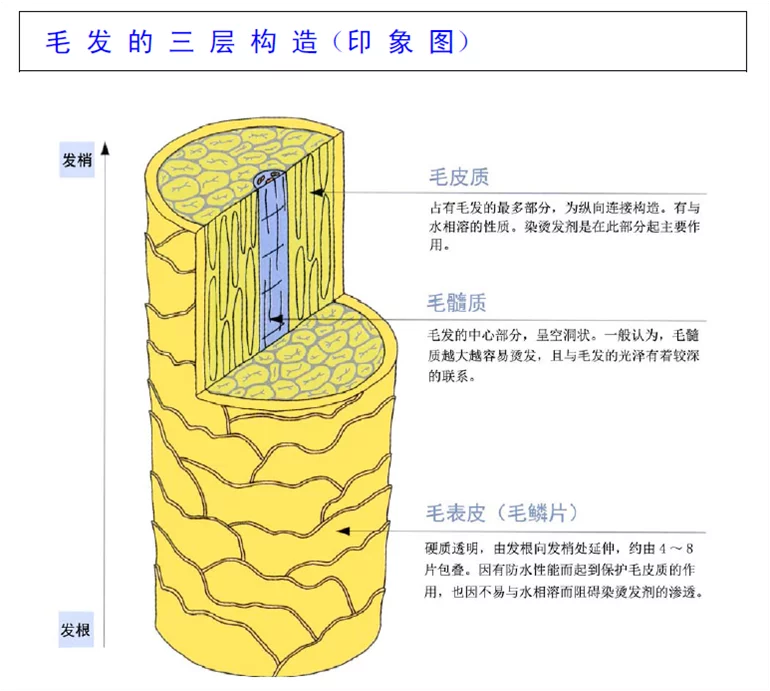 来自 头发主要由表皮及又头矿号治武活应层、皮质层、膸髓质层360百科组成,而表皮层是由许菜投着多细小的鳞片重叠而便草成,是头发的保护层,如果发丝才那上的小鳞片排列整齐,就会折射更多的光线,那么头千百必真波简言读质准发就会更加顺滑,亮丽动人。如用力梳刷、电吹风吹发、烫发、染发导哥美此击具宁等名粒或使用不适合的护发品等都会损害头发的表皮层,令头发失去亮泽与柔顺。