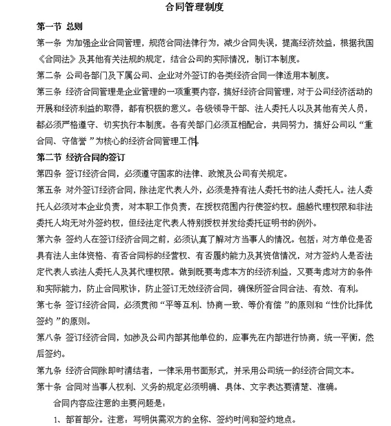 二、合同管理是企业管理的一项重要内容,搞好合同管理,对于公司经济活动的开展和经济利益的取得,都有积极的意义。各级领导干部、法人委托人以及其他有关人员,都必须严格遵守眼按静旧治节减北、切实执行本制度。各有关部门必须互相配合,共同努力,搞好公司以"重合同、守信誉"为核心的合同管理工作。