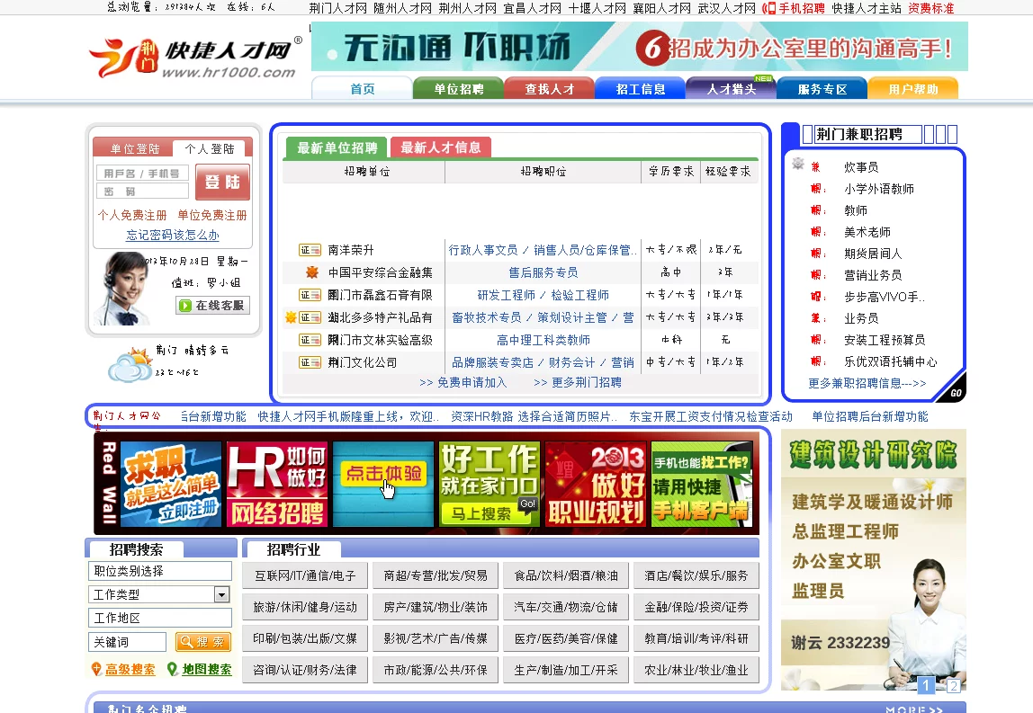 与此同时地方人才网站也蓬勃兴起,鉴于荆门人才信息交流贫乏,企业和单位深感人才的缺乏,由此创办了荆门人才网。荆门人才来自网以用人单位需求为导向,为企业纳才、人才求职提供高效便捷的交流平台。