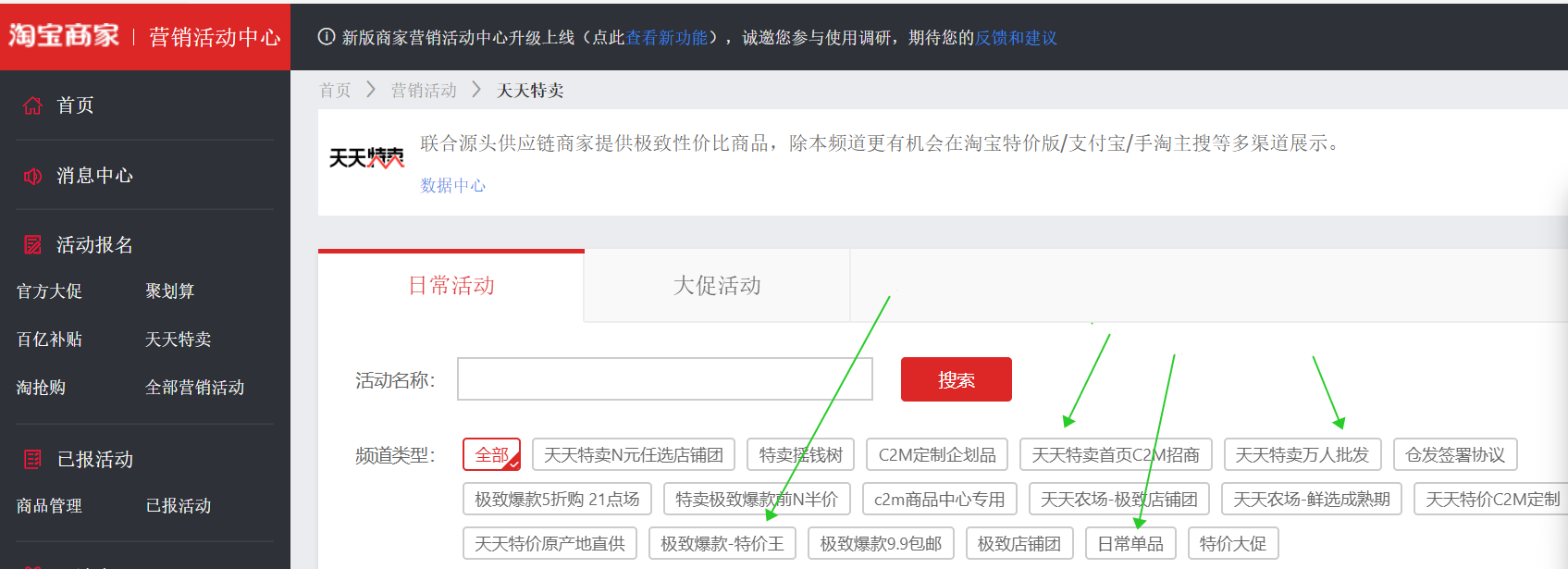 天天特价已更新为新版,报名入口为:【点击此处进入】-【选择对应活动】-点击【去报名】,淘宝卖家和天猫商家统一招商入口哦~~