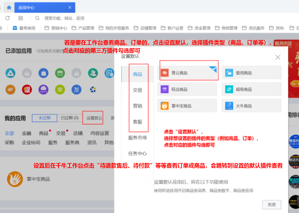 默认插件设置后,在千牛工作台点击“待退款售后、待付款”等等查看订单或商品,会跳转到设置的默认插件查看