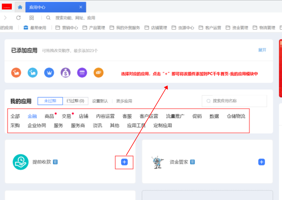 亲,打开千牛工作台,点击“我的应用”-“更多应用”,找到对应的想添加的插件,点击“+”即可将该插件添加到PC千牛首页-我的应用模块中