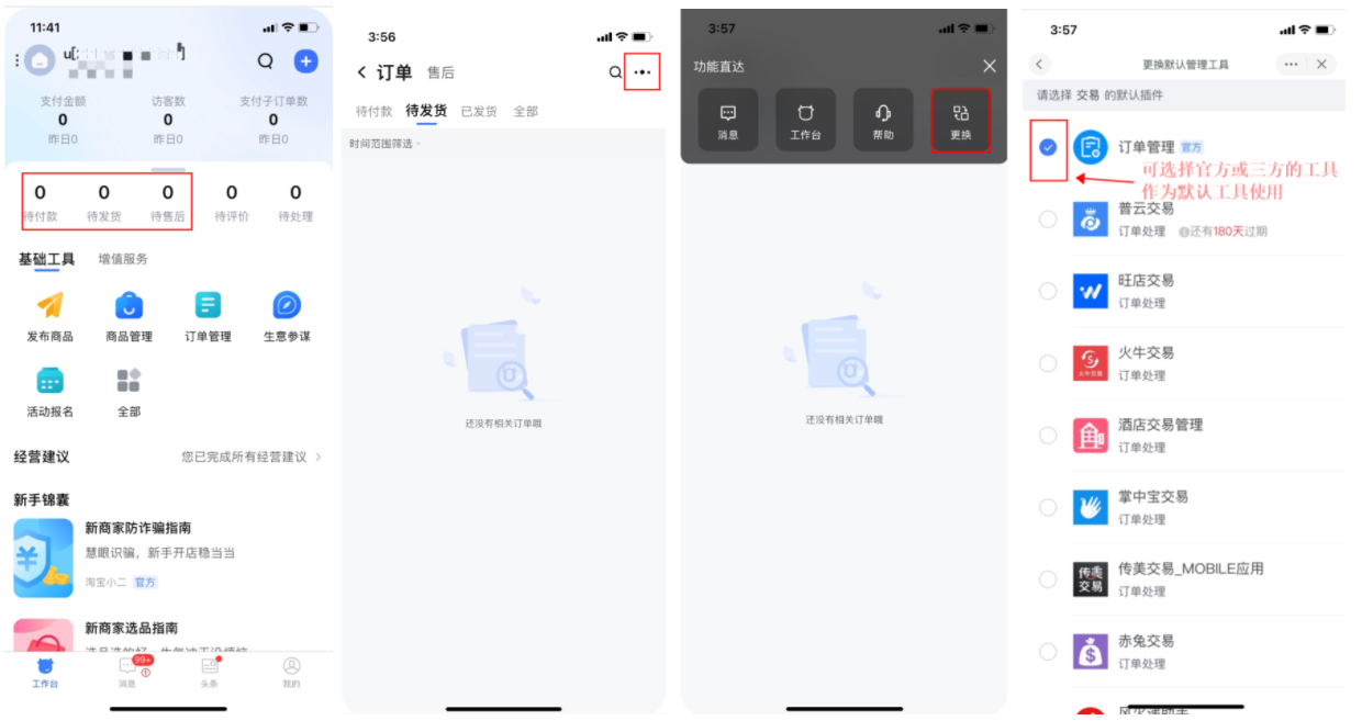 ③手机千牛点击“待付款、待发货、待售后” 等查看订单的插件,可自行设置官方或第三方的默认插件,设置后在手机千牛点击待付款、待发货等就会跳转对应的插件查看,设置步骤如下: