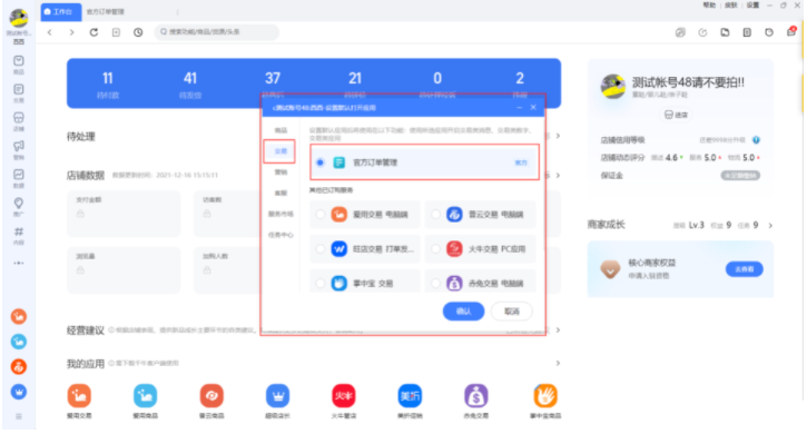 ③选择交易插件类型,选择官方交易插件,并点击确认完成设置,设置后在千牛工作台点击“待发货、待售后、待付款、待评价”等等查看订单,会跳转到设置的默认插件查看