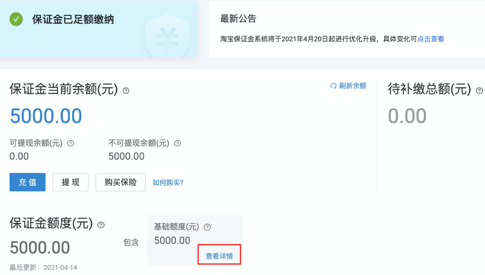 淘宝保证金系统于2021年4月20日起进行优化升级,保证金额度计算进行了变化,主要根据卖家上个自然月成交的订单对应的商品类目额度取最高值,及卖家违规带来的缴纳要求等作为基础保证金额度,若上个自然月无成交则以1000元为保证金额度。新开店商家若店铺未成交,保证金额度显示0,表示暂无需缴纳,同时建议您可多充值保证金。时,您可在保证金页面【基础额度】模块-【查看详情】,查看保证金额度对应的订单及商品类目,【类目额度详情】可查看各类目应缴保证金金额。 点击展开全文 转载请注明出处安可林文章网 » 为什么我的保证金额度有变化?