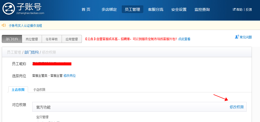请主账号进入【卖家中心】-【子账号管理】,在【子账号管理】栏目下找到需要被授权的子账号,鼠标移到子账号名字上点击“修改权限”,再在【功能权限】内搜索“分流管理”后点勾选保存即可