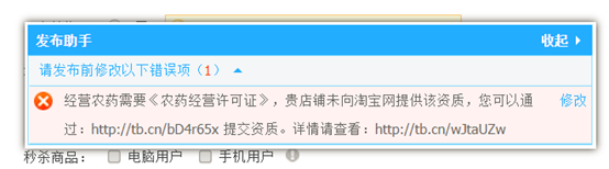 2、资质准入后,发布商品务必如实填写“农药登记证”、“农药生产许可证”、“产品标准”等信息,若填写不正确会导致发布不成功或排查下架处罚等问题。