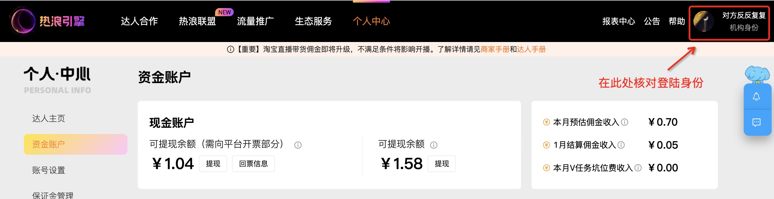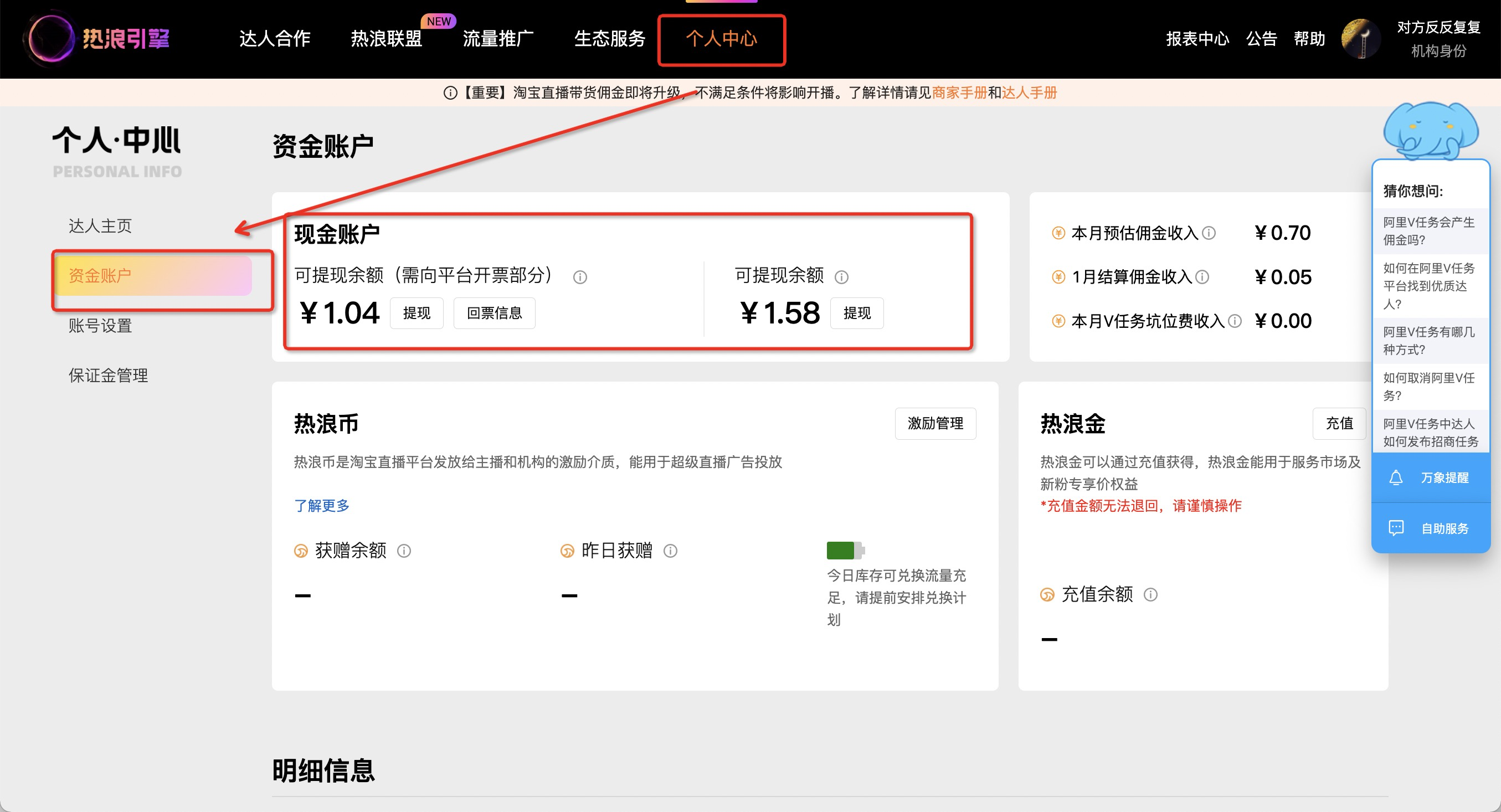 请登陆热浪引擎平台(hot.taobao.com),登陆选择达人/机构身份,前往“个人中心”——“资金账户”中进行佣金提现,如下图所示: