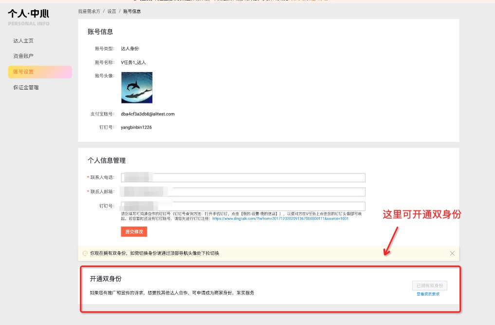 若您的账号没有服务方身份,可通过“个人中心”——“账号设置”开通达人、机构或服务商身份。