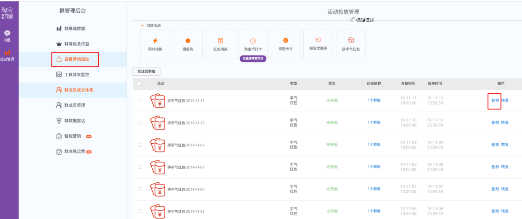 4、红包删除及退回:红包池的金额和个数,不可以删除和修改,但是可以删除拼手气红包的群营销活动。活动删除界面如下截图: