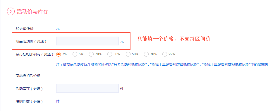 1、淘金币大部分活动支持多SKU但价格一样的商品报名,多sku但价格不一样商品,则不能报名哦。进入报名入口后,只能填写一个价格 温馨提示:活动报名成功后,切勿再修改多SKU价格,一旦多SKU价格不一致,淘金币抵扣比例就会失效,或者造成抵扣比例计算错误,有可能造成资损哦。 2、淘金币小部分商品,可以支持sku报名: ① 招商规则中,明确指出,可以报名多sku。 ② 进入报名入口后,不要求填写单一价格。 点击展开全文 转载请注明出处安可林文章网 » 有SKU价格区间的商品,能否报名淘金币活动?