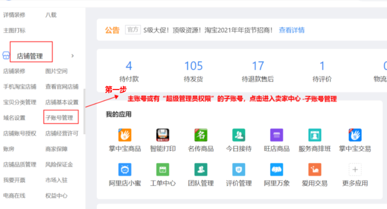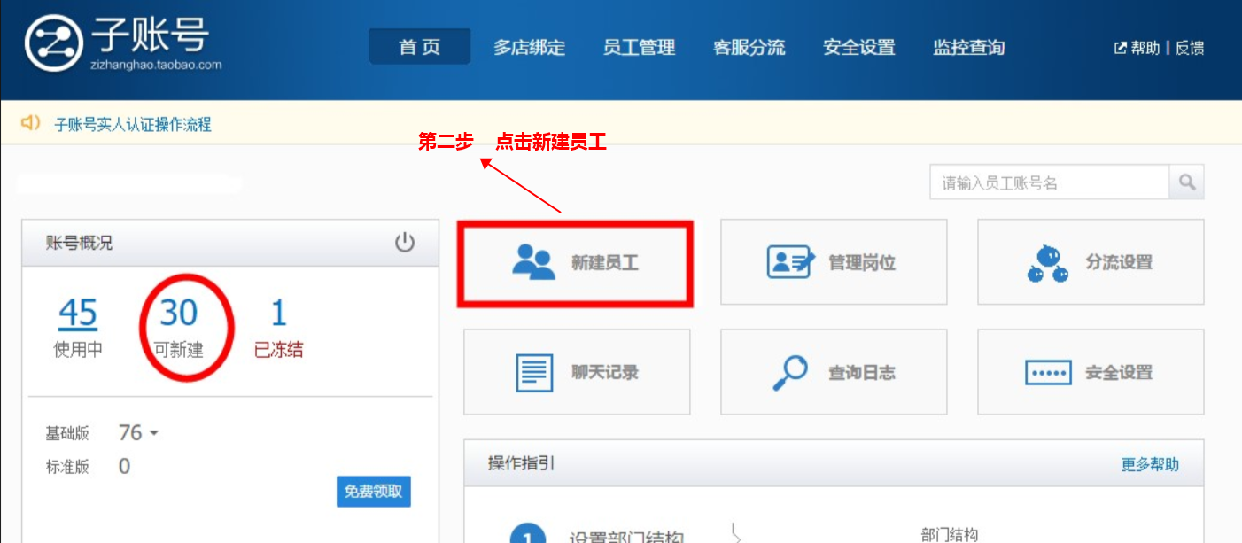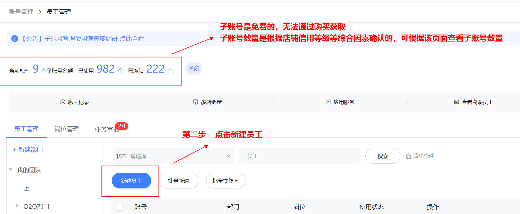 1. 主账号进入【卖家中心】-【子账号管理】,进入子账号管理首页(点此进入),点击【新建员工】