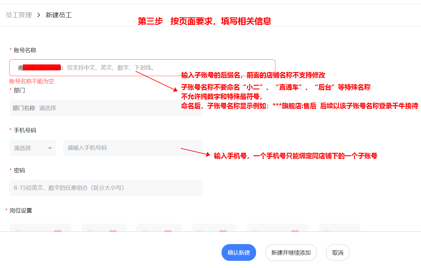 6、店铺内子账号命名不能重复,若提示已被占用,请通过【子账号管理】-【员工管理】搜索已重复命名的账号进行操作恢复使用;若未搜索到该子账号请在“查看离职员工”中搜索