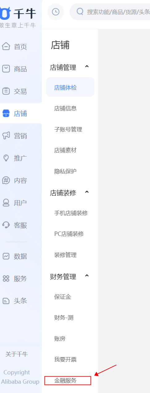 新版本PC千牛商家金融中心入口:左侧菜单栏“店铺”-“财务管理”-“金融服务”,仅支持主账号查看