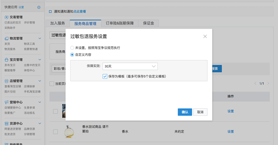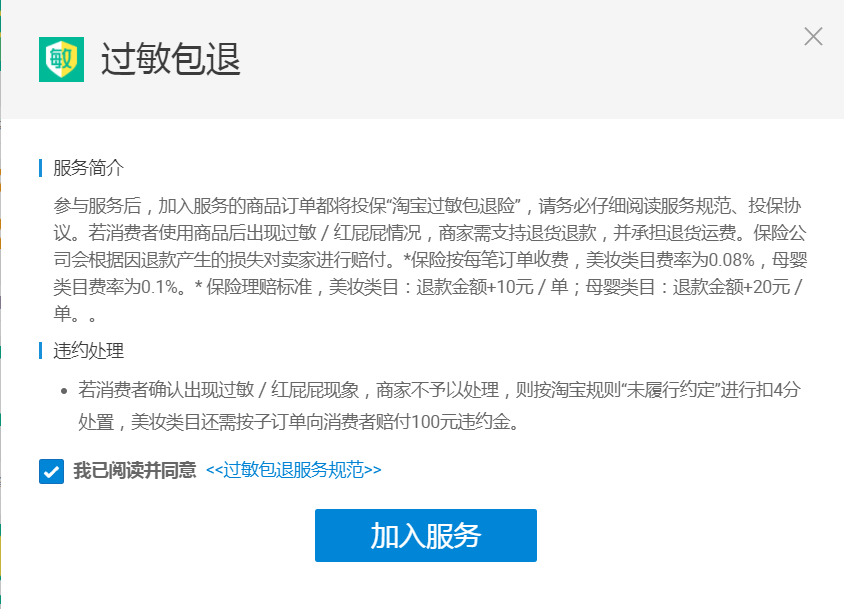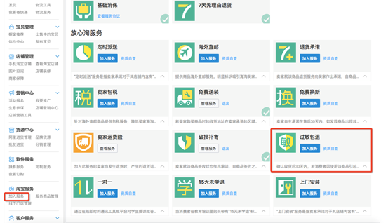 为了提供更优质的保险产品及服务,部分保险产品(包含无忧退货服务)将下线优化和调整,升级完成后为您提供全新的保险产品。辛苦您耐心等待。具体服务下线内容可参考:第一批下线服务点此查看;第二次下线公告点此查看;第三次下线公告点此查看亲,具体操作如下:1.您可以通过【卖家中心】-【淘宝服务】-【加入服务】选择【过敏包退】服务2.点击【加入服务】3.可根据商品类目,选择商品进行设置4.点击【自定义内容】选择保障时效5.设置成功后,在商品详情页打标“过敏包退”6.买家拍下付款,卖家发货后,保险扣费出单在已卖出的宝贝列表页,保险服务查看保险详情页【温馨提醒】:若需要查看订单的保单,也可在以上路径查看 点击展开全文 转载请注明出处安可林文章网 » ‘过敏包退’知识汇总