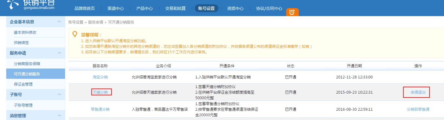 供应商取消合作中的所有天猫分销商后,在后台【账号设置】-【 可开通分销服务】中,选择“天猫分销”,点击“申请退出”之后即可解冻保证金。