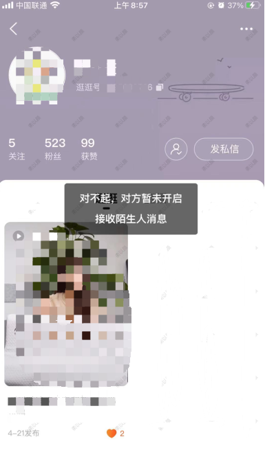 亲,如您遇到在逛逛个人主页点击“发私信”,提示“对不起,对方暂未开启接受陌生人消息”的问题。