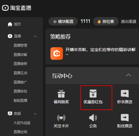 设置入口:直播间优惠券设置通过【直播中控台】(点此可直达)-【互动中心】-【优惠券红包】各类优惠券设置方法:直播间各类优惠券如何设置,请点此查看;注:发放需用户完成任务型优惠券和红包 (如点赞xx领取) ,将不会在直播间亲密度中展示,直接在直播间的右 侧面展示;设置入口图:升级后的优惠券展示位置: 点击展开全文 转载请注明出处安可林文章网 » 直播过程中如何发放优惠券?