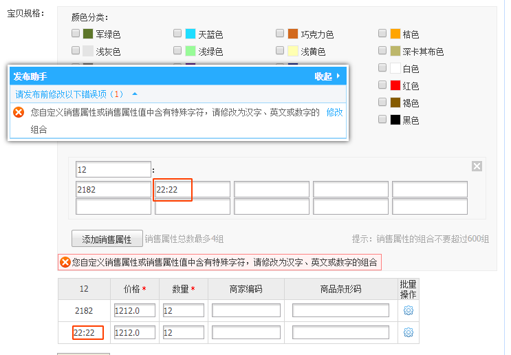 请您调整您所自定义设置的属性信息,其中因为特殊字符不兼容问题导致无法发布,建议不要使用字符。 点击展开全文 转载请注明出处安可林文章网 » 为什么发布提示“您自定义销售属性或销售属性值中含有特殊字符,请修改为汉字、英文或数字的组合”?