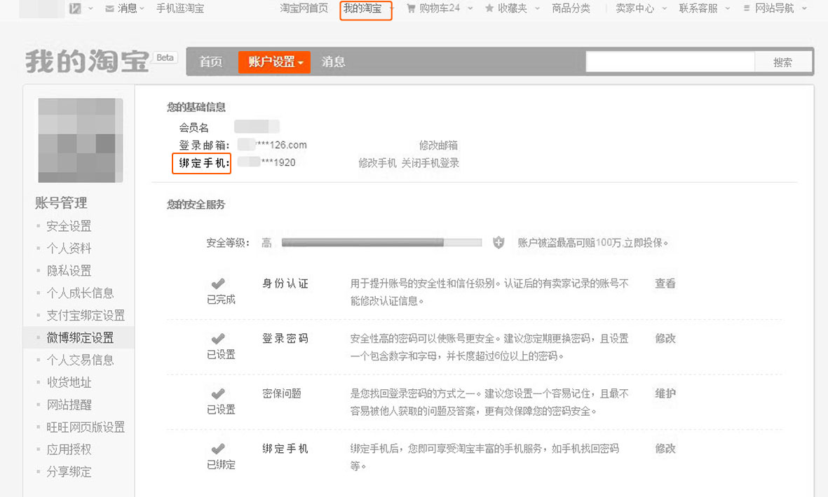 您可以登录您的淘宝账号后,点击 【我的淘宝】—【账户设置】—【安全设置】 中查看,点此进入查看温馨提示:为了提高您的淘宝账号的安全性,手机号码和邮箱不会全部显示 点击展开全文 转载请注明出处安可林文章网 » 我绑定的手机号码是什么?