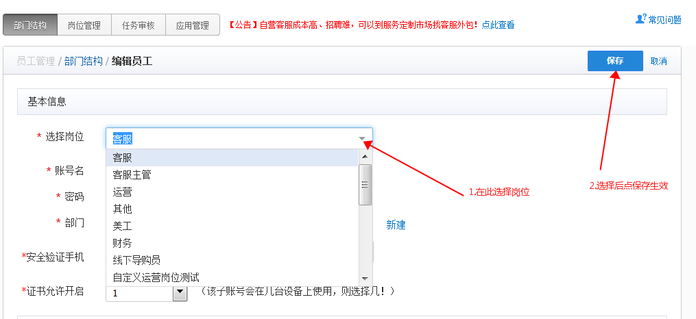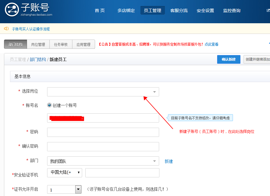 2.给子账号赋予岗位;若还没有创建子账号,请主账号进入【卖家中心】-【子账号管理】-【首页】-【新建员工】时确认员工岗位