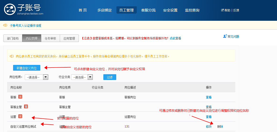1.岗位介绍及新建自定义岗位:请主账号登录【卖家中心】-【子账号管理】-【员工管理】-【岗位管理】,根据常规客服岗位及权限,系统会默认新建好几种官方岗位(岗位右侧显示“官”,该类岗位赋予最普遍的权限,例如官方的客服岗位,会默认开启查看订单、评价管理的权限);若您需要自定义岗位并对该岗位赋予自定义权限,请点击“新建自定义岗位”进行添加