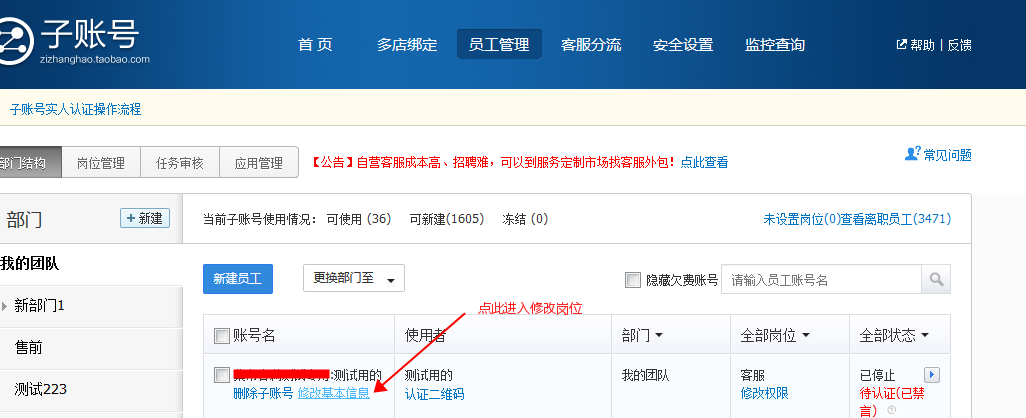 若已创建的子账号需要修改岗位,请主账号进入【卖家中心】-【子账号管理】-【员工管理】找到该子账号,鼠标移到子账号名称上点击“修改基本信息”进入选择岗位