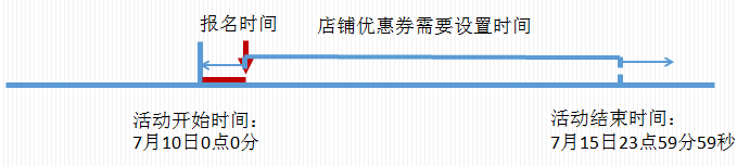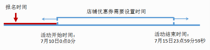 例如:活动时间7月10日0点0分~7月15日23点59分,则您需要设置优惠券的开始时间要早于(或者等于)7月10日0点0分,结束时间要晚于(或者等于)7月15日23点59分,如设置7月9日~7月16日(生效期为9号0点~16号23点59分59秒),则满足要求;设置时间7月11日~16日,则不满足。图例如下