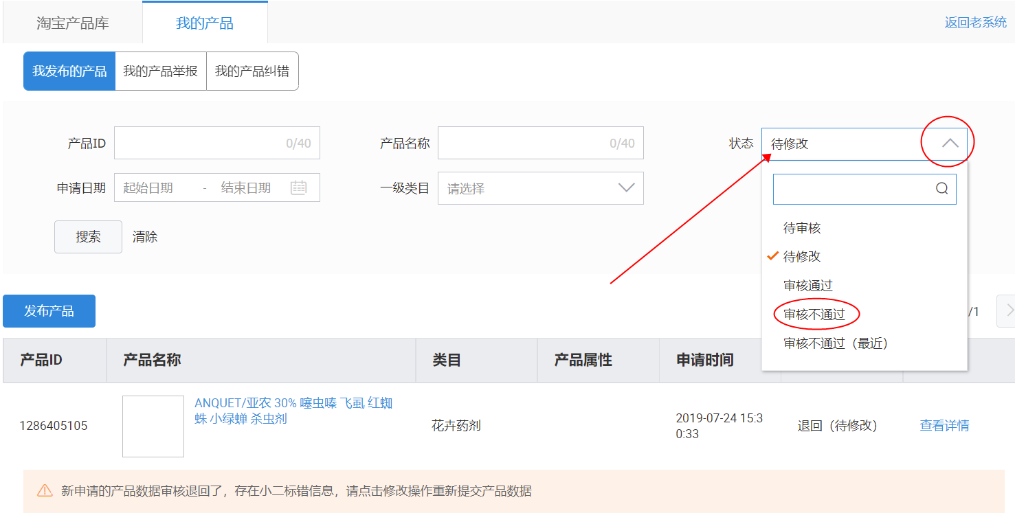 可以到【卖家中心】-【宝贝管理】-【我的产品库】-【我发布的产品】里查看。注意:页面上默认展示待修改的spu,如您需要查看审核不通过或者全部申请的spu,则需要选择不同的状态,或者删除筛选项。 点击展开全文 转载请注明出处安可林文章网 » 如何查看产品型号(SPU)审核进度和结果?