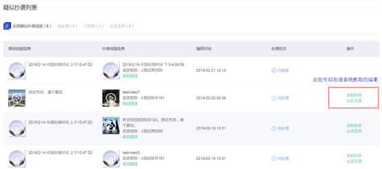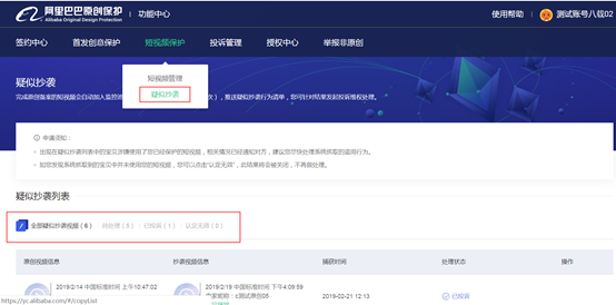 方法一:若您的短视频已经审核备案为原创,且已经在监控中。系统将定期检索盗用行为。您可以点击短视频保护-疑似抄袭,在此页面你可以对系统检索到的盗用结果做出处理,点击发起投诉,盗用的商品将实时被处理。展示如下: