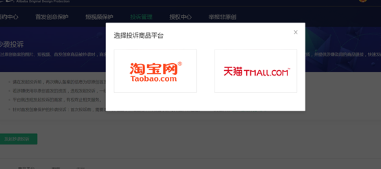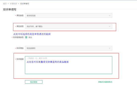 方法二:若您的视频未做监控,或者系统未能识别到盗用,产品提供了人工投诉渠。您可以点击投诉管理-发起抄袭投诉,选择要投诉的商品平台,按照页面提示,原创类型选择“首发短视频”,原创资质为“通过首发备案的视频名称”,您可以提交单个或批量提交涉嫌侵权的商品发起投诉。页面展示如下: