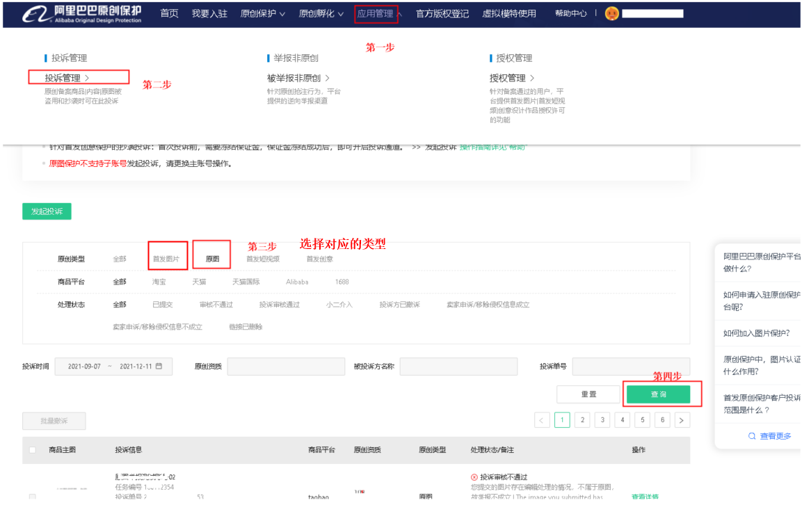 盗图投诉撤诉入口,您可以通过原创保护平台,【应用管理】-【投诉管理】-点击【原图】-【查询】,或点此查看,即可查询到所有的投诉原图或首发图片的记录,找到对应投诉单号,点击撤销。平台完成申诉处理后,则不再支持撤销。